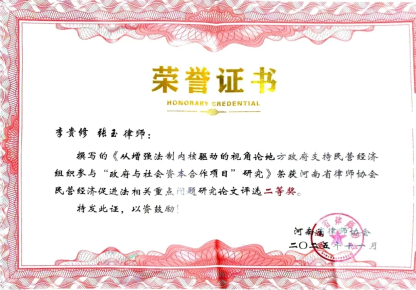 11月16日,河南省律师协会民营经济促进法优秀论文征集颁奖仪式在焦作市迎宾馆隆重举行。经过多轮严格评审,我所副主任、高级合伙人李贵修、执业律师张玉共同撰写的《从增强法制内核驱动的视角论地方政府支持民营经济组织参与“政府与社会资本合作项目”研究》脱颖而出,荣获南省律师协会民营经济促进法相关重点问题研究论文评选二等奖,彰显了我所在民营经济法治保障领域的专业实力。