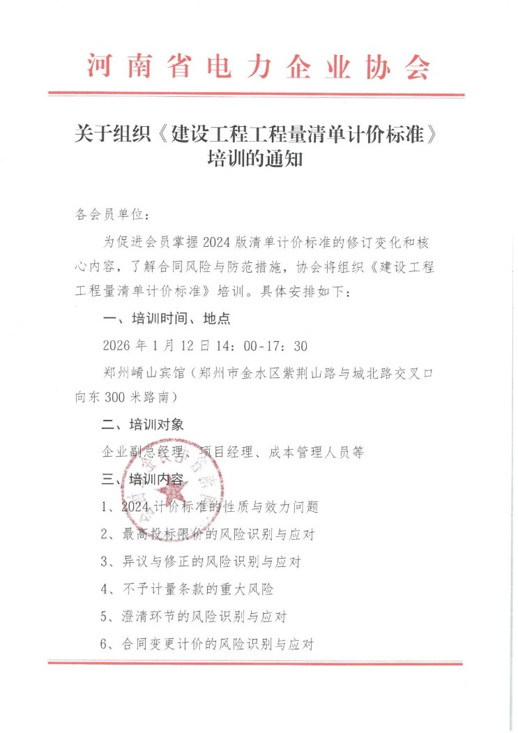 2026年1月12日,本所栗魁主任受邀赴河南省电力企业协会开展《建设工程工程量清单计价标准》培训。本次培训有近70家参会单位,参会人员近200人,遍布全省各地。