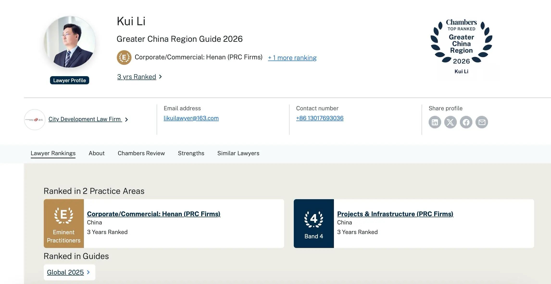 栗魁主任继2025年荣登最高荣誉——(Eminent Practitioner)业界贤达,于2026年再次荣登业界贤达。凭借极高的市场赞誉度,栗魁主任荣登钱伯斯“项目与基础设施领域”律师榜单Band 4,全国仅22位。