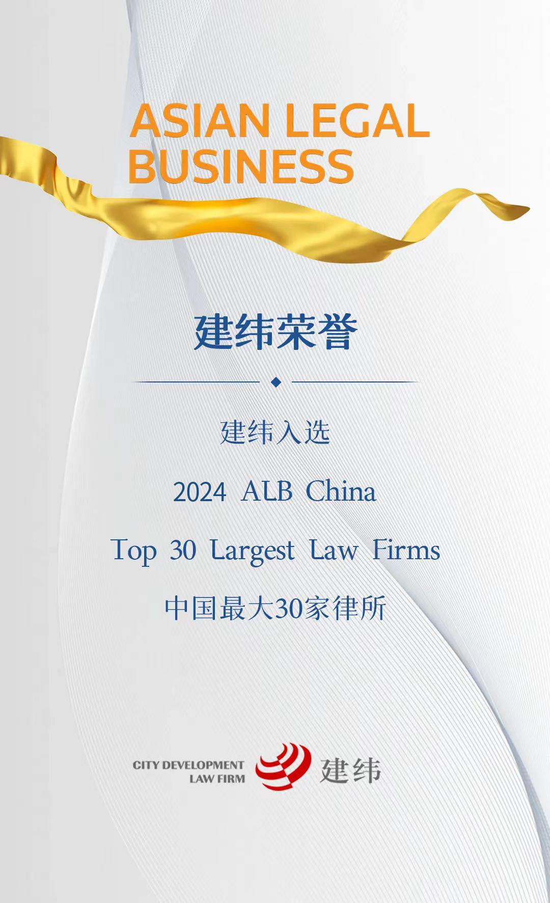 2024 年,汤森路透旗下权威法律媒体《亚洲法律杂志》(ALB)公布 “中国最大 30 家律所” 榜单,上海市建纬律师事务所凭借强劲综合实力,连续 5 年蝉联该榜单,彰显行业领先地位。