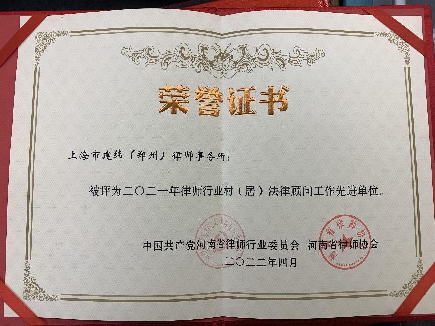 建纬(郑州)律师事务所被评为2021年律师行业村(居)“法律顾问工作先进单位”