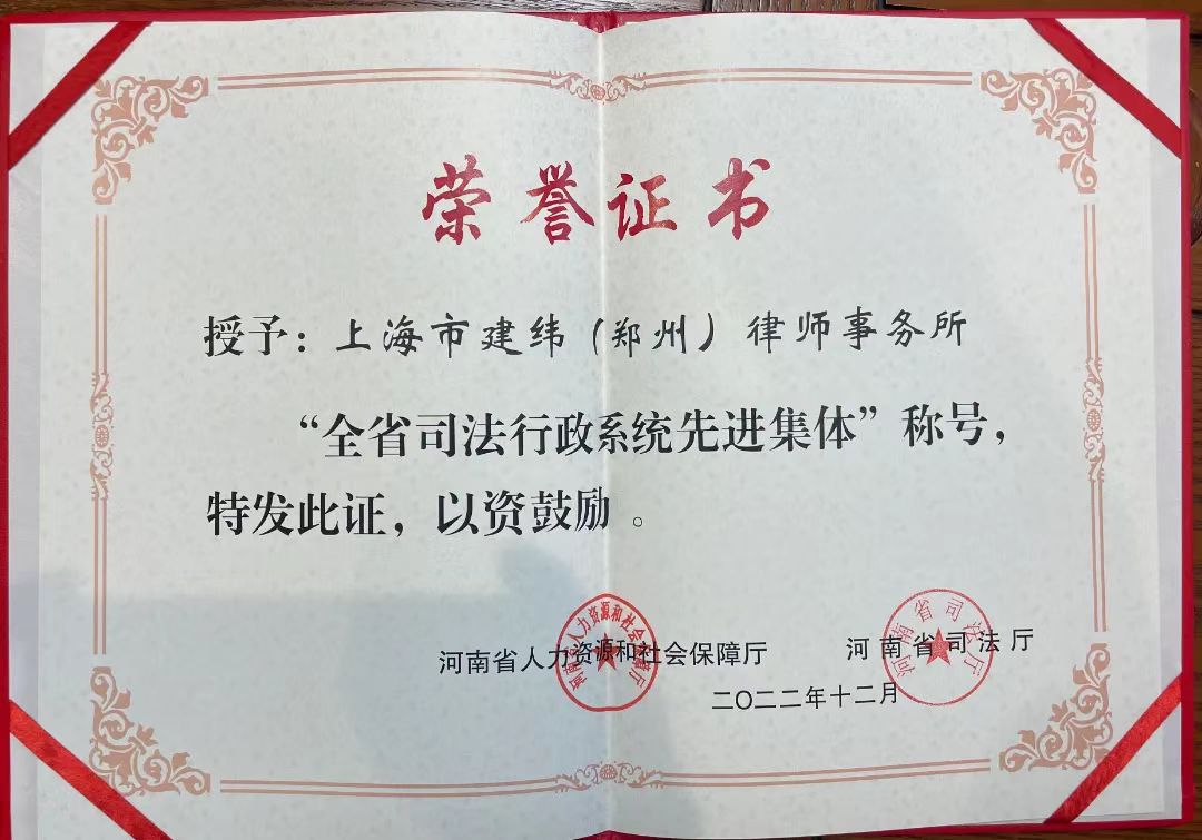2023年1月9日,河南省人力资源和社会保障厅、河南省司法厅印发《关于表彰全省司法行政系统先进集体和先进工作者的决定》,上海市建纬(郑州)律师事务所被评为全省司法行政系统先进集体。