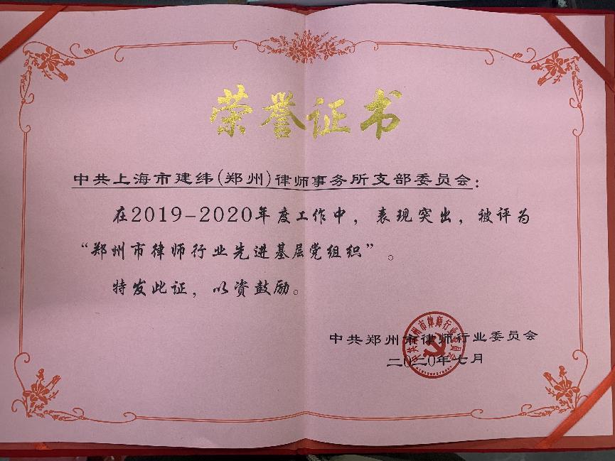 2020年度中共郑州市律师行业委员会表彰建纬(郑州)律师事务所党支部“先进基层党组织”称号