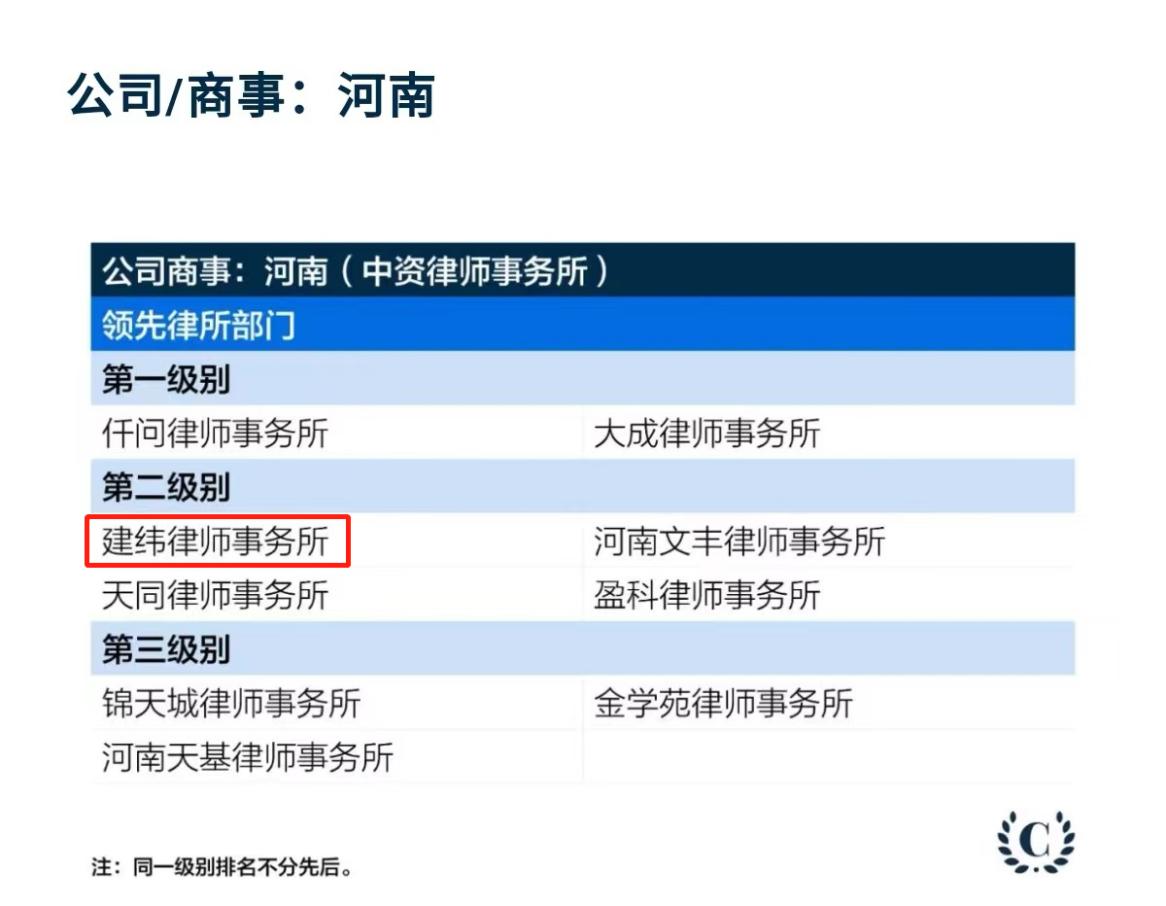 2023-07-012023 年,国际权威法律评级机构钱伯斯(Chambers and Partners)发布《钱伯斯大中华区法律指南(2023)》,上海市建纬(郑州)律师事务所以专业实力荣登公司商事领域(河南)Band2 榜单。 钱伯斯榜单以严谨调研与客户反馈为核心依据,是全球法律服务领域的权威基准。此次上榜,彰显了律所在公司设立、并购重组、商事争议解决等业务的行业认可度。建纬(郑州)深耕中原市场,以精准的法律解决方案赋能企业合规发展,为区域商事活动筑牢法治保障,用专业实力赢得国际权威机构的肯定。