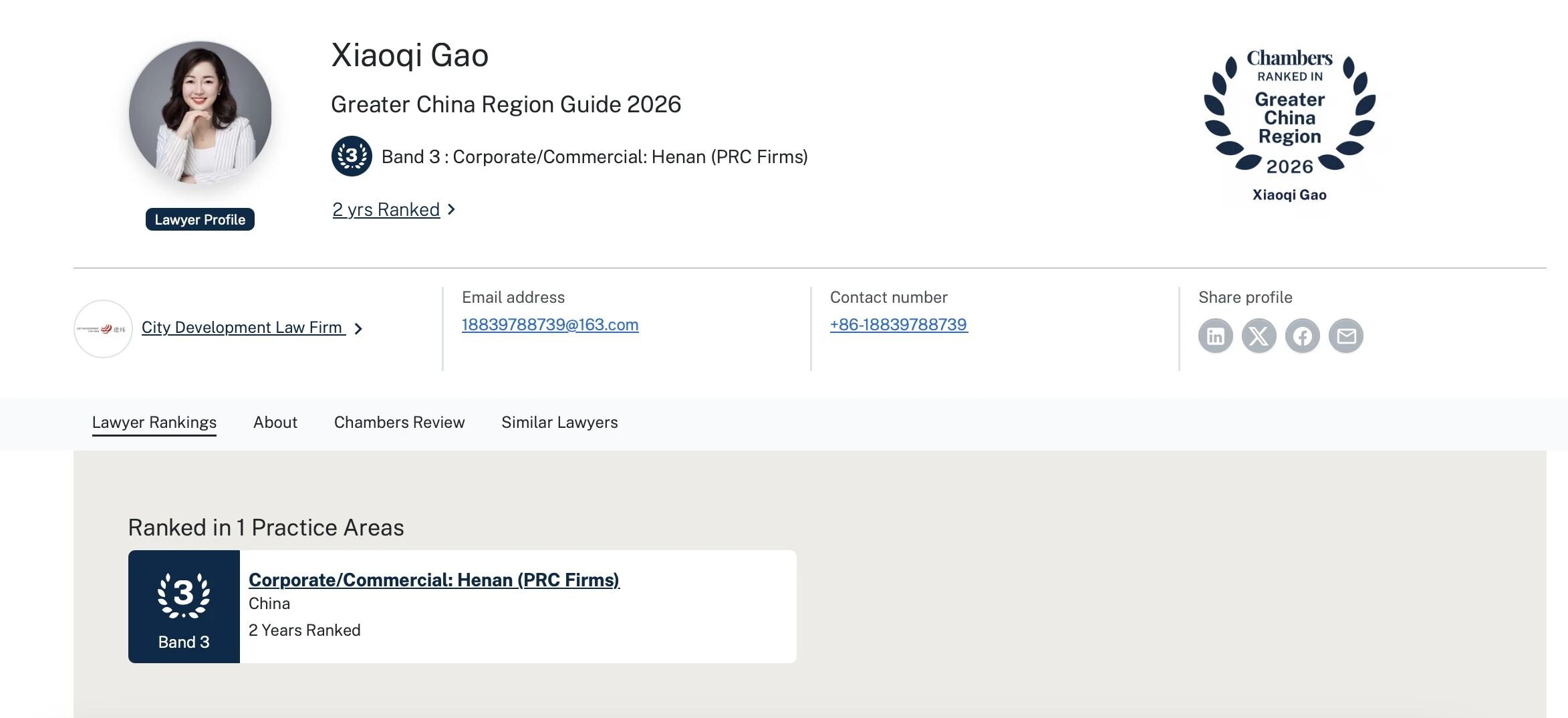 我所高级合伙人高小琦律师连续两年荣登第三级别。