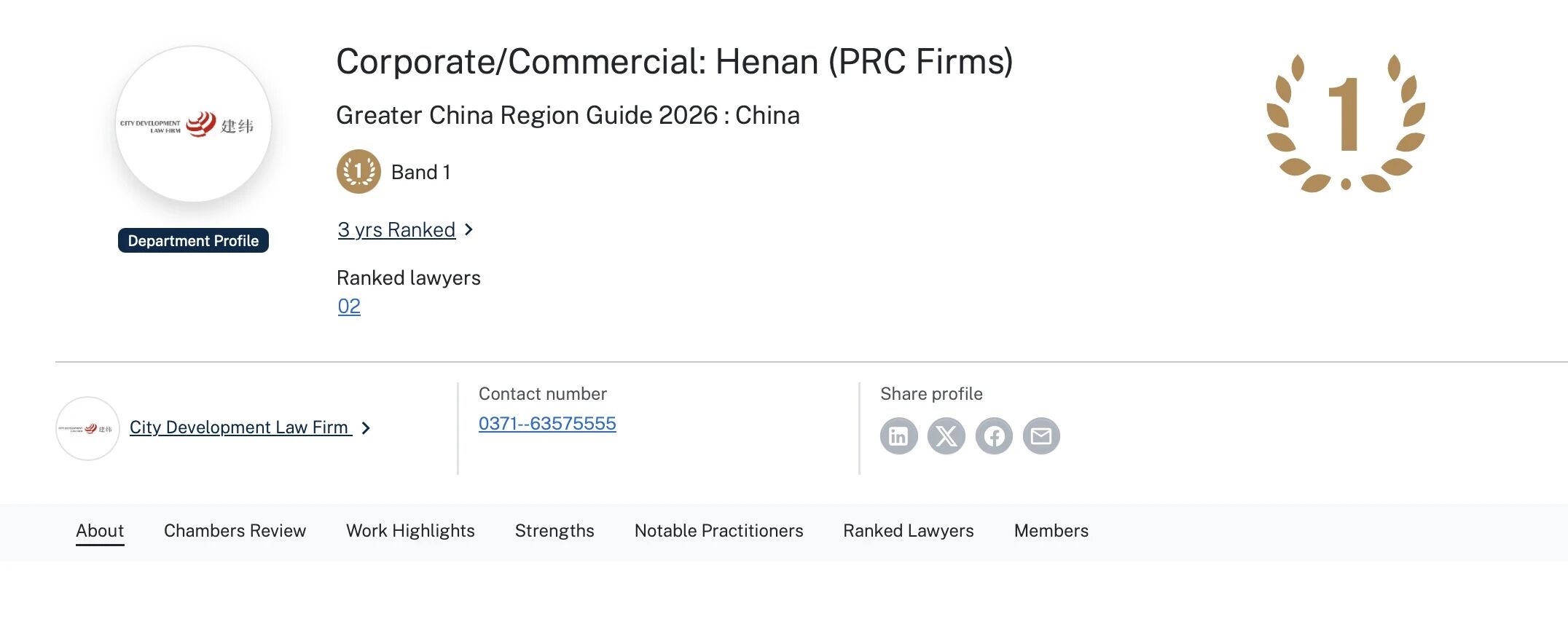 建纬郑州连续四年上榜,并在连续三年(2024年至2026年)蝉联“公司商事(河南地区)”第一级别,第一级别仅上榜三家。十载春秋,建纬郑州已在中原大地深深扎根,律所始终稳健发展,团队不断壮大,市场占有率持续提升。如今,已成为中原大地上一支不可忽视的律政劲旅。