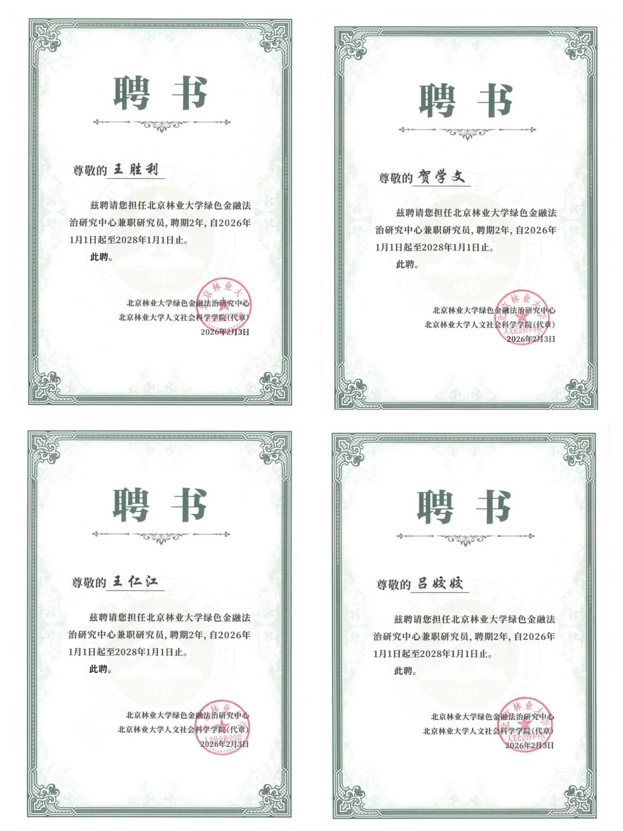 近日,我所高级合伙人王胜利、贺学文、王仁江、吕姣姣四位律师正式获聘为北京林业大学绿色金融法治研究中心兼职研究员,聘期自2026年1月1日至2028年1月1日。这一聘任由北京林业大学人文社会科学学院颁发,标志着本所律师在绿色金融与法治交叉领域的专业能力与实践经验获得高校与研究机构的权威认可。